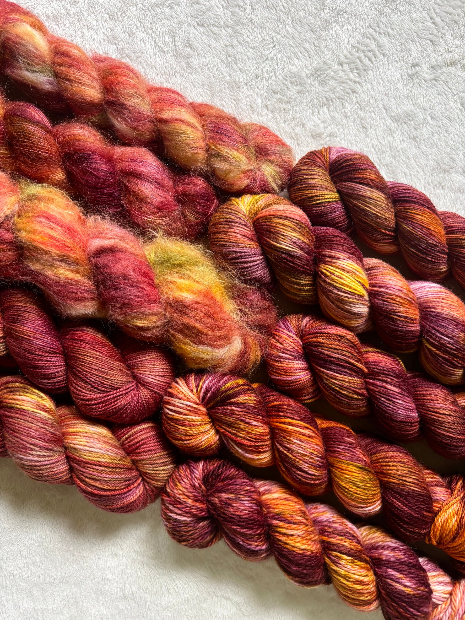 This is one of my personal favorites! The rich colors of Cherry Tomato all pop at once and it blew me away when I first dyed it. I knew it was the perfect representation of a big bowl of mixed cherry tomatoes🤤 This colorway is a variegated blend of deep red, rich orange, grass green, and saffron yellow. This is one of the more “bold” colors of the collection, and I hope you love it as much as I do!🧡
