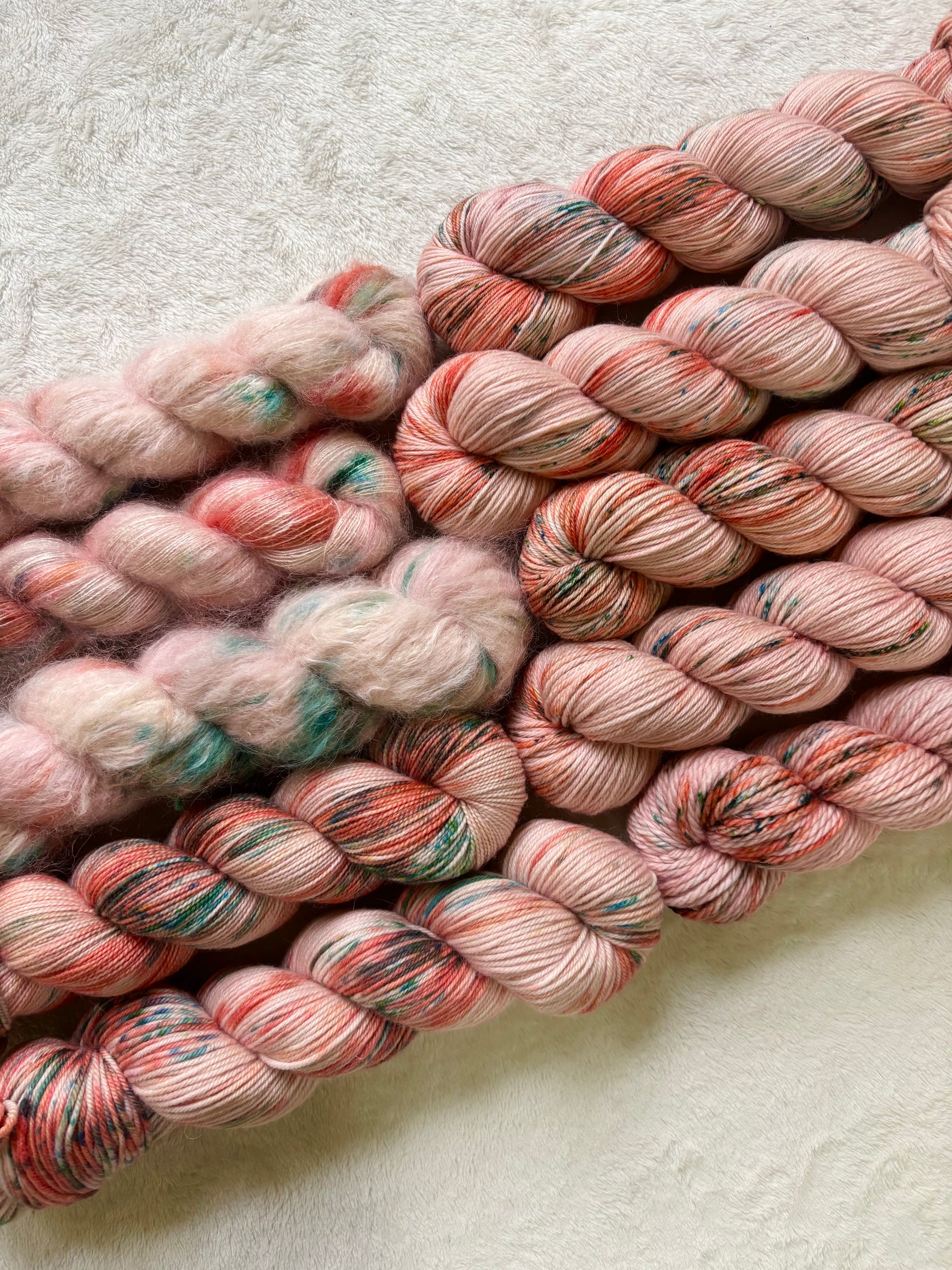 Strawberries boasts a soft pink base with bright red variegation and finished with some leafy green speckles. This colorway is a stunner and gives me all the bright and sunny summer vibes☀️
